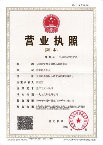 天津市寶盈金屬制品有限公司成立于1998年,公司坐落于天津市津南區(qū)小站工業(yè)園。距津港高速公路2公里,塘沽港25公里,天津?yàn)I海國(guó)際機(jī)場(chǎng)25公里,海、陸、空交通十分便利。公司占地面積10000平方米,年生產(chǎn)能力4500噸金屬制品,包括辦公室人員及車(chē)間工人寶盈共有100多名員工。 2010年6月2日,通過(guò)了ISO9001:2008質(zhì)量管理體系認(rèn)證,2012年5月由摩迪國(guó)際進(jìn)行焊工考試,取得EN 287-1焊工資格證書(shū)。
